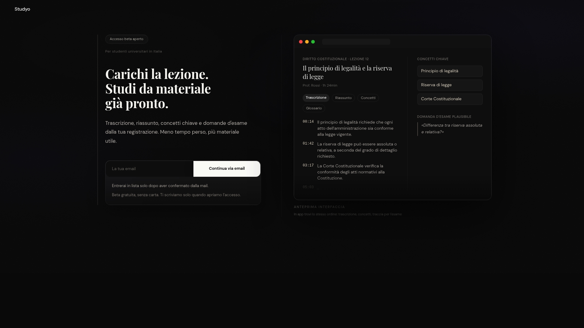 Studyo è la piattaforma pensata per gli studenti universitari italiani che vogliono trasformare le registrazioni delle lezioni in materiale di studio strutturato. In pochi minuti ottieni trascrizioni, riassunti, flashcard e domande in stile esame, tutto pronto per iniziare subito a fare autovalutazione. Non devi più riorganizzare appunti o cercare il punto giusto nella registrazione. Puoi concentrarti su ciò che conta: verificare quanto hai capito e prepararti in modo efficace. Scopri come preparare il materiale per l'esame con Studyo e inizia a studiare meglio da oggi.